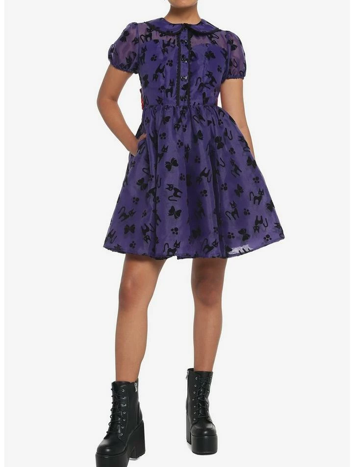 For our next broomstick delivery, we’re serving nothin’ but looks! Take to the skies with this puffy dress on, and with your favorite black cat, of course! This Kiki’s Delivery ServiceΒ dress features velvet prints of Jiji, bows and paw prints tossed all over, plus black bow buttons down the center chest and at the back to hold the oversized, removable satin ribbon. Complete with elasticated puffy sleeves, a collar and button placket with black lace trim, a sweetheart neckline, pockets and back zipper closure.