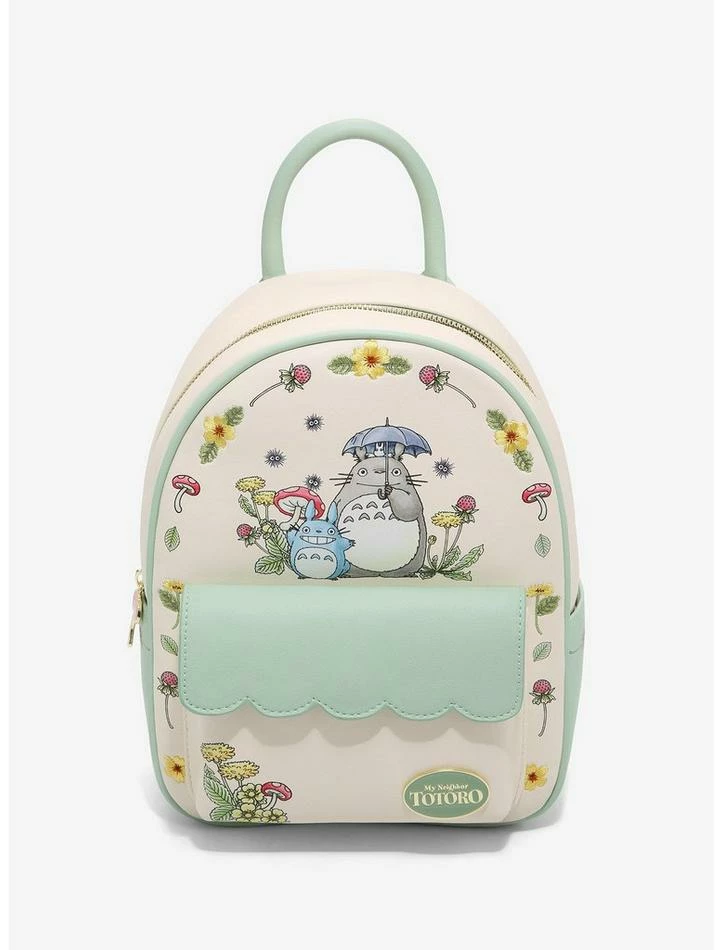 Hopping aboard the Cat Bus? Make sure you have your essentials with you before you ride! Let the forest spirits watch over your stuff with thisΒ My Neighbor TotoroΒ mini backpack. Featuring all the Totoros in a watercolor-inspired print and Soot Sprites falling around them, plus a border of forest fauna and embroidered flowers. Comes with a mushroom zipper charm and a scallop-edged front pocket. Complete with side pockets, adjustable straps and interior zipper pocket.Β