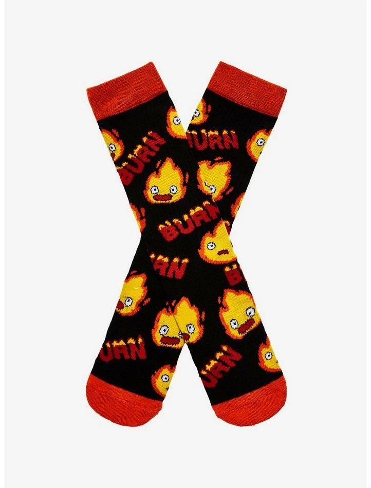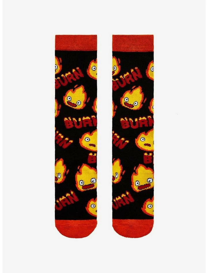 May all your bacon burn… and may you keep your toes warm with these crew socks! Add something lit to your outfit with this pair of socks from Howl’s Moving Castle, featuring an allover toss of Calcifer with “Burn” in fiery letters.