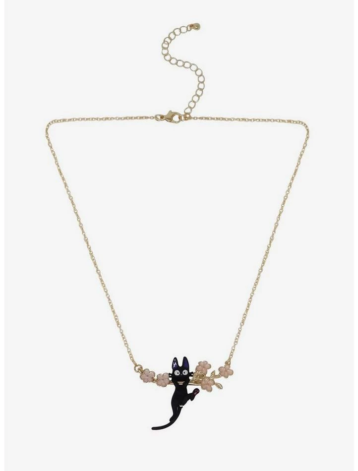 This gold tone chain necklace from Kiki’s Delivery Service features Jiji hanging on a sakura blossom branch.