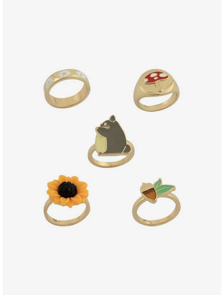 Take a bit of the forest with you when you wear these rings from My Neighbor Totoro featuring Totoro, acorn, flower and mushroom designs.