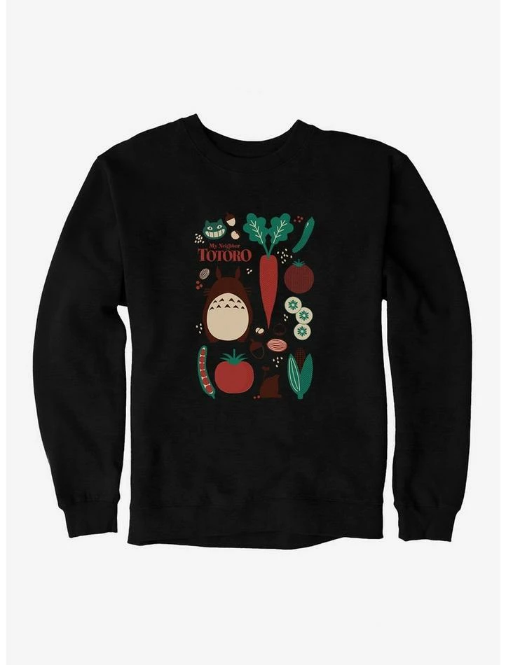 Eat your veggies! This sweatshirt — inspired by the Studio Ghibli favorite, My Neighbor Totoro — features some healthy snacks, a smiling Catbus, and Totoro silhouettes.