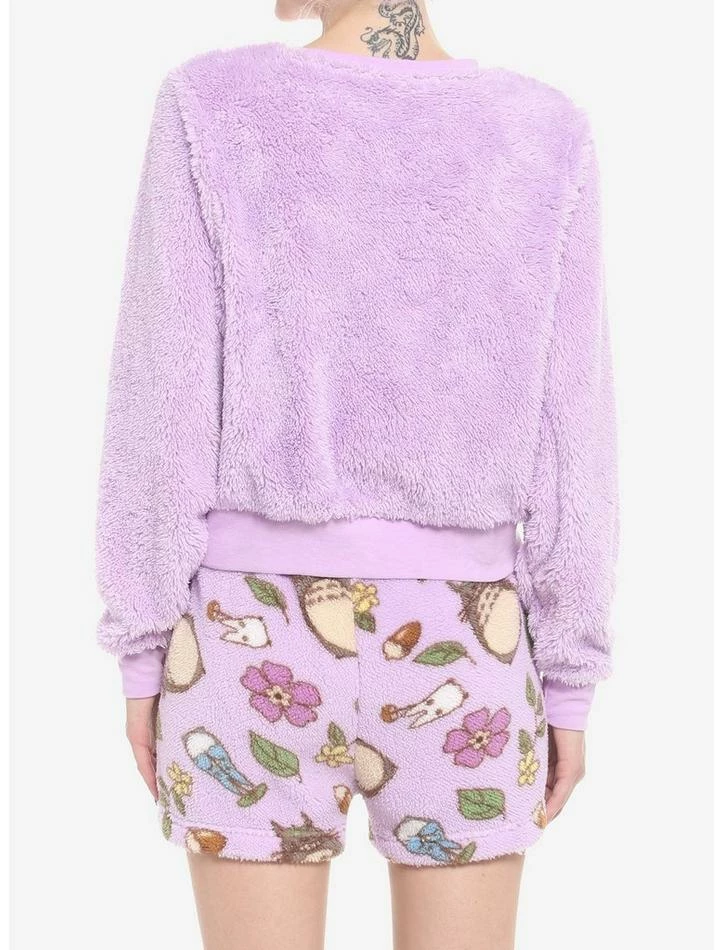 Get ready for bedtime with the Totoros in this super cozy, fuzzy lounge set! The sweater has super detailed embroidery of the Totoros on the chest, plus Japanese text. The shorts are a teddy bear fabric andย have Totoros and leaves printed on them, with a drawstring waistband.