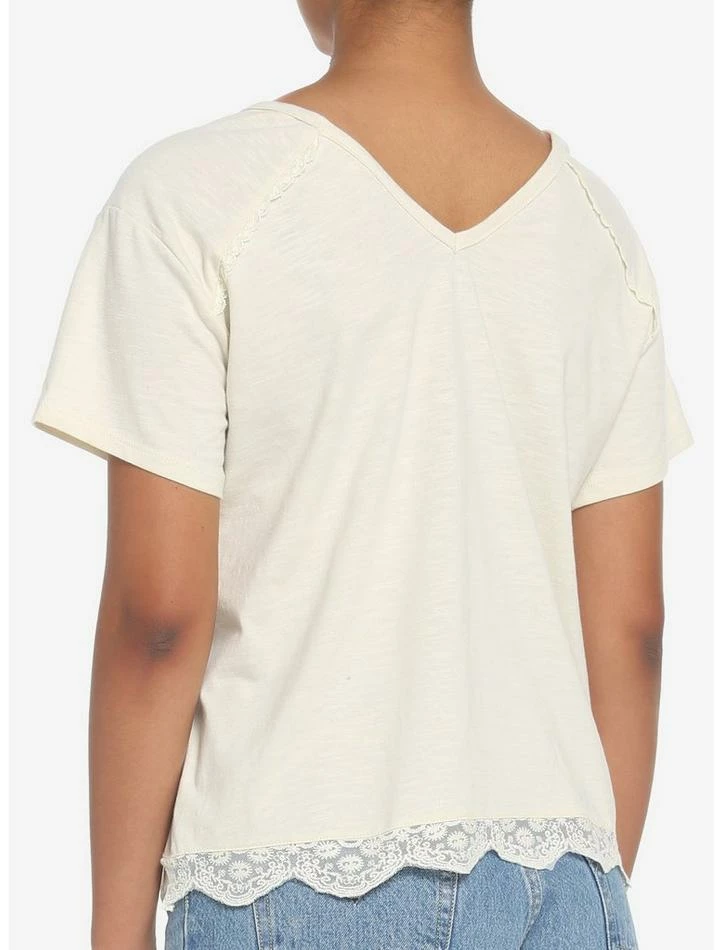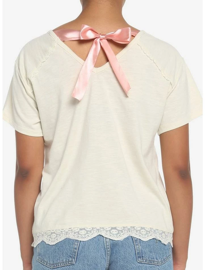 This My Neighbor Totoro-inspired tee is perfect for when you want a blend of casual but supercute and delicate. It has a cottagecore style graphic on the front with Totoro, lace on the bottom hem and shoulder seams, and a pretty pink ribbon you can tie in the front.